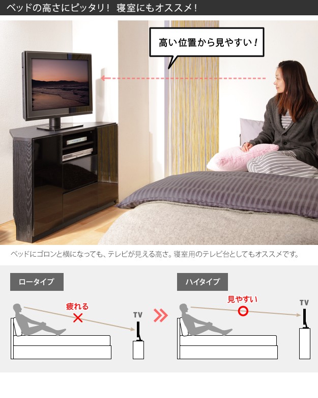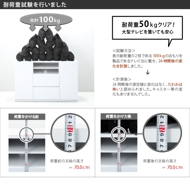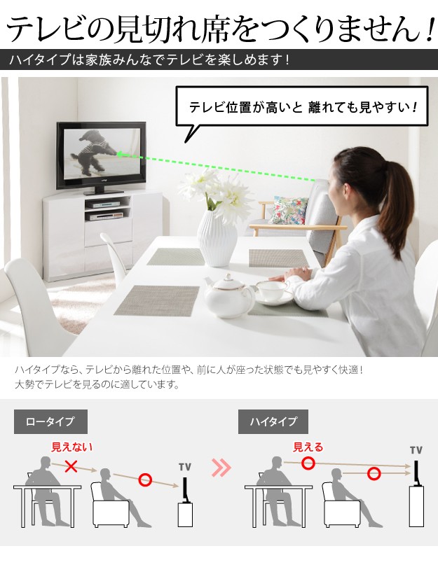 ●商品について:ダイニングテーブルからでもテレビが見やすい高さに仕上げたハイタイプTVボードです。台を高くすることでテレビの見える範囲が広がり、視点が変わると見えづらくなるイライラを解消!隠しキャスター付きで配線作業やお掃除もラクラク。鏡面仕上げのスタイリッシュな扉。棚(可動棚板3枚)と引き出しでたっぷりの収納スペースを。DVDはもちろんゲーム機や通信機も収納できます。天板耐荷重は約50kg。