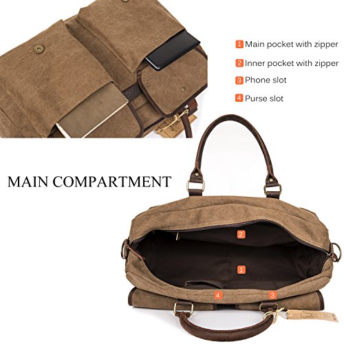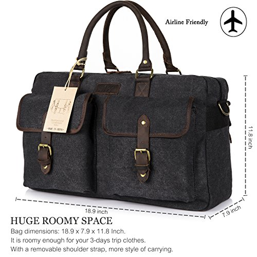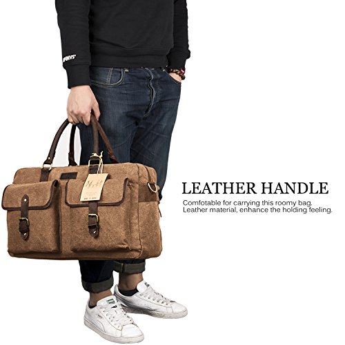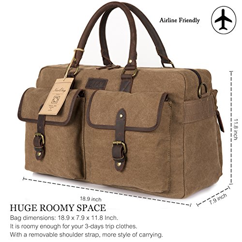 -. Feature : Huge roomy space bag for travel. Bag dimensions:18.9 x 7.9 x 11.8 Inch. / Made of high quality canvas.Durable and High quality. high density Canvas provides the function of water-resistance and scratch-proof. / Genuine Crazy-horse Leather around. Specially design processing makes the leather more exquisite. Never allow high temperature and cutting with knife. Keep the bag dry always. This Crazy-horse leather is easy to be scratched, Use a dry cloth to wipe, the scratch will disappear. / Functional inner pockets.1 inner pocket with zipper. Keep precious items like purse, keys, money etc; 1 purse slot; 1 phone slot; 1 back pocket with zipper; 2 front pockets with button.Keep power bank,water bottle,books,keys etc. / Occasions: 3 days trip, travel, weekend activity, shopping, on a plane etc.