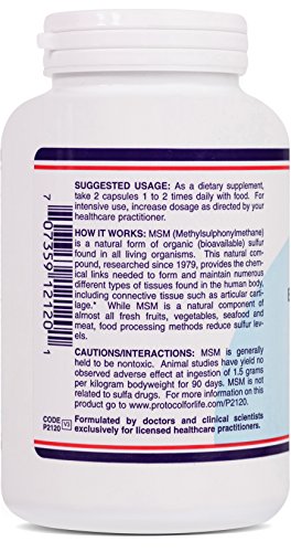 HOW IT WORKS: MSM (Methylsulphonylmethane) is a natural form of organic (bioavailable) sulfur found in all living organisms. This natural compound, researched since 1979, provides the chemical links needed to form and maintain numerous different types of tissues found in the human body, including connective tissue such as articular cartilage.* While MSM is a natural component of almost all fresh fruits, vegetables, seafood and meat, food processing methods reduce sulfur levels. Protocol For Life BalanceTM MSM is tested to contain a minimum of 99.7% purity.Protocol For Life Balance® is an A-rated GMP manufacturer of pharmaceutical grade dietary supplements created for healthcare practitioners. Our product line is comprised of effective, science-based formulations intended to address common nutrient deficiencies and support healthy physiological function. These formulations are based on the latest advances in nutritional science and incorporate trademarked ingredients of the highest quality. Our serving sizes are based on doses used in clinical trials and other published data, and the ingredients used in our products have been tested for efficacy in clinical trials and laboratory studies.