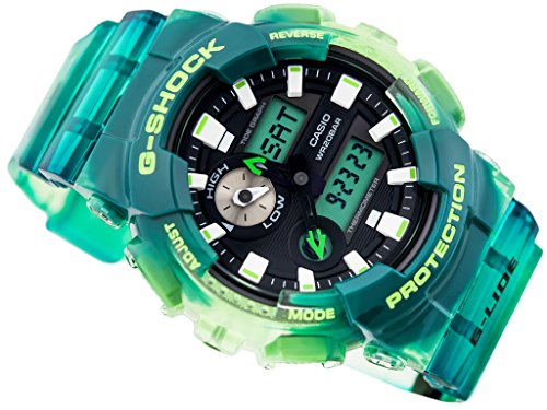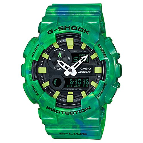 The big case GAX100, whose combination analog and digital format delivers the information you need in an instant. The model was inspired by the ever-changing spectacles on display in the great natural beauty of Hawaii. Blue semi-transparent resin is formed using mixed color molding that reproduces the gradations reflecting off of the ocean surface. Function-wise, this model comes equipped with a Tide Graph, which is a must for surfers. The GAX100 has a dial at 10 o'clock that is an analog tide graph. Moon Data and temperature measurement also provide intuitive tide information that supports your rides, no matter where they take you.Feature