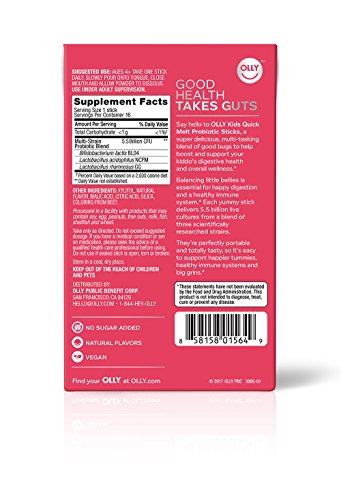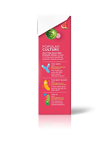 Say hello to OLLY Kids Quick Melt Probiotic Sticks, a super delicious, multi-tasking blend of good bugs to help boost and support your kiddo's digestive health and overall wellness. Balancing little bellies is essential for happy digestion and a healthy immune system. Each yummy stick delivers 5.5 billion live cultures from a blend of three scientifically researched strains. They're perfectly portable and totally tasty, so it's easy to support happier tummies, healthy immune systems and big grins.Feature