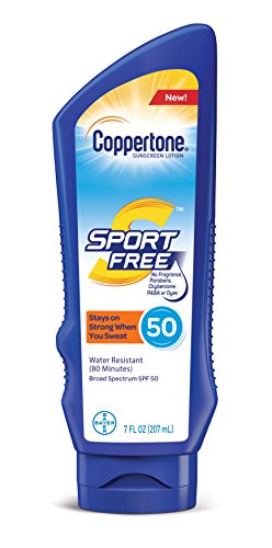 Simple protection with Coppertone SPORT FREE Sunscreen Lotion that is free of oxybenzone, parabens, PABA, and fragrance. Designed to stay on strong when you sweat, this high-performance sunscreen protects you from the sun with a durable and water-resistant formula (80 minutes) that leaves a light, breathable feeling on your skin. Delivering broad spectrum UVA/UVB protection, this sunscreen contains moisturizers and Vitamin E to help your skin's antioxidant defense. Depend on this tough sunscreen for outdoor activities where every moment counts, whether it's at the big game, the jobsite, running or cycling. This pack includes one 7-fluid-ounce SPF 50 sunscreen lotion bottle. Use and reapply as directed.Feature