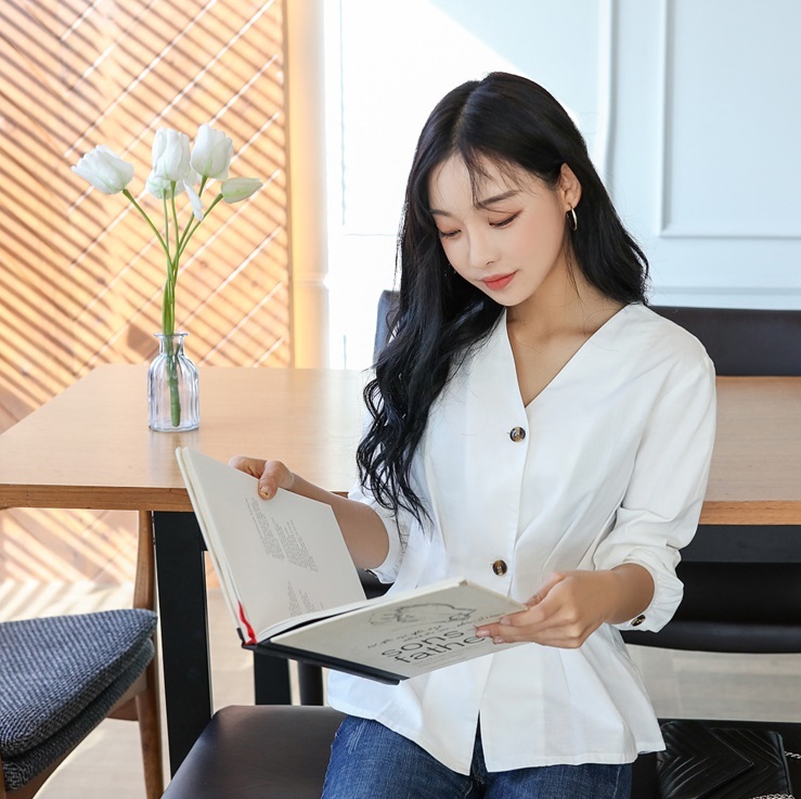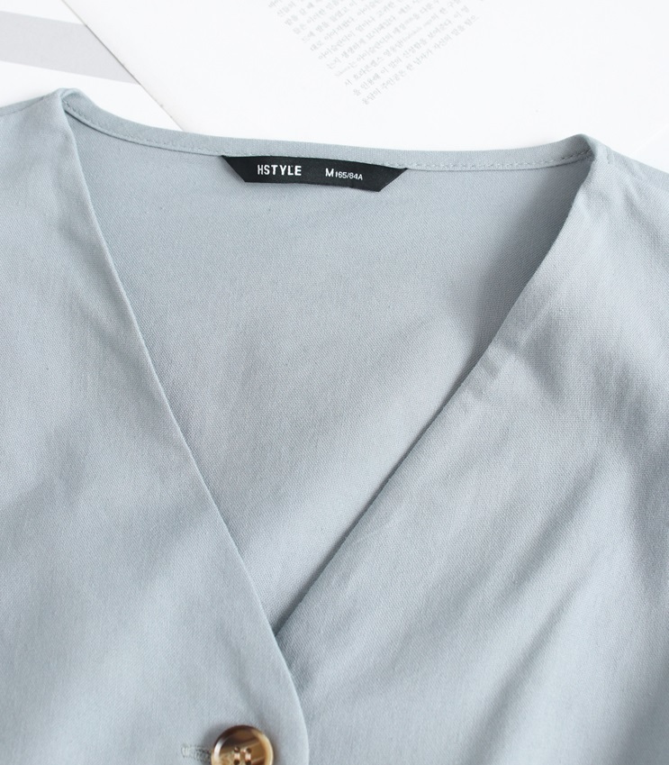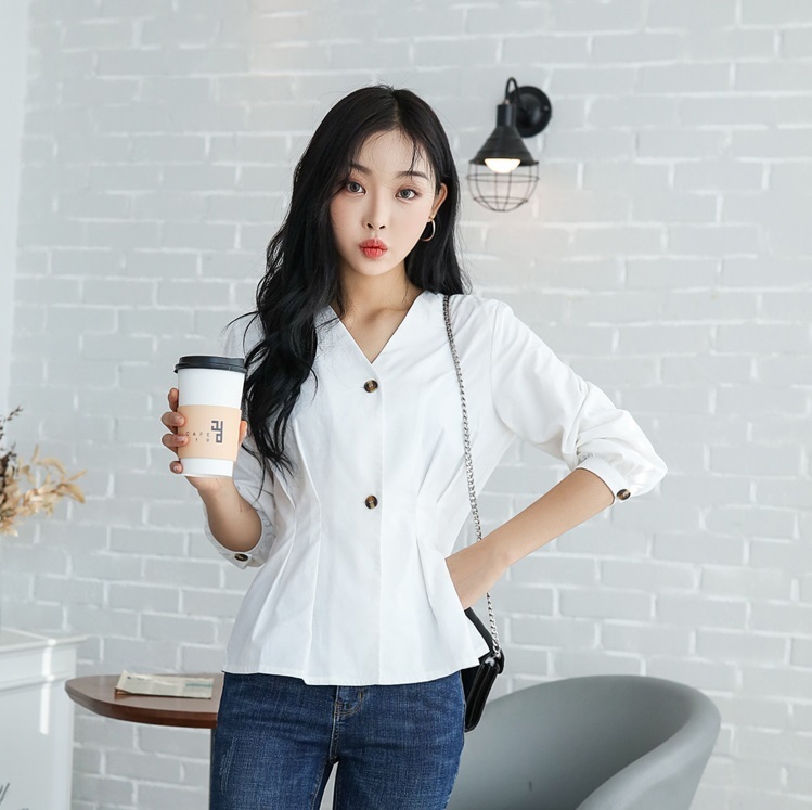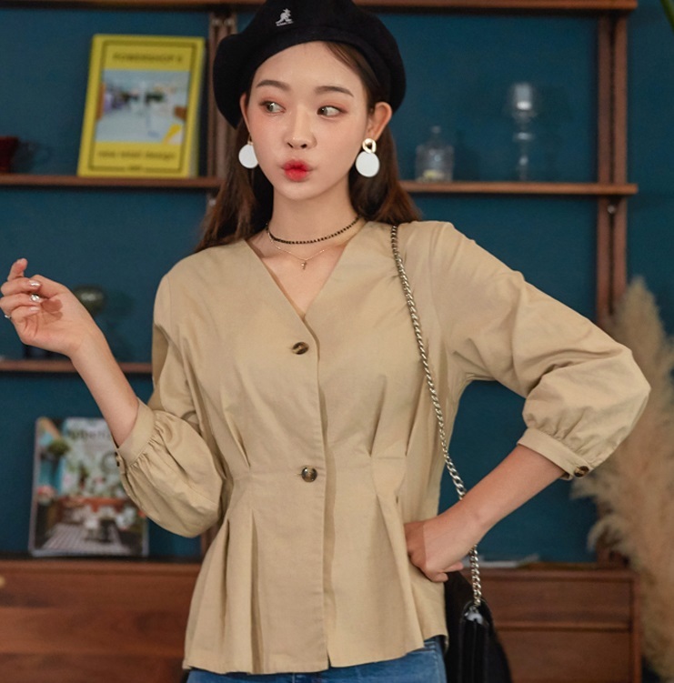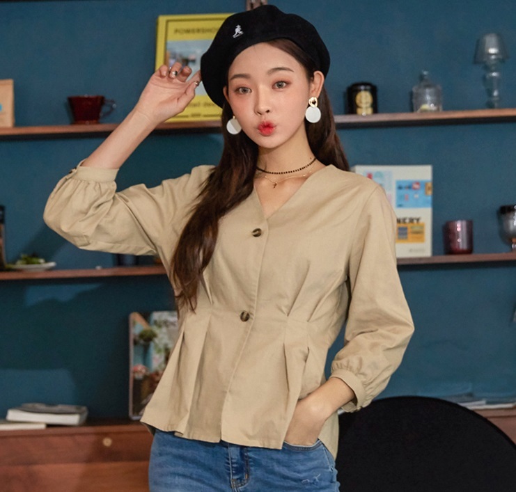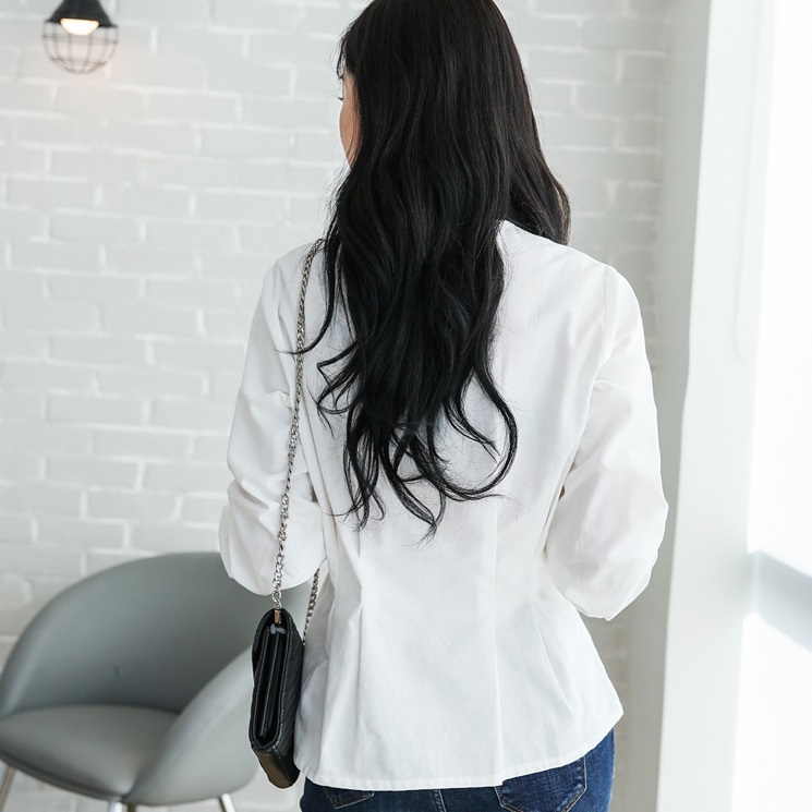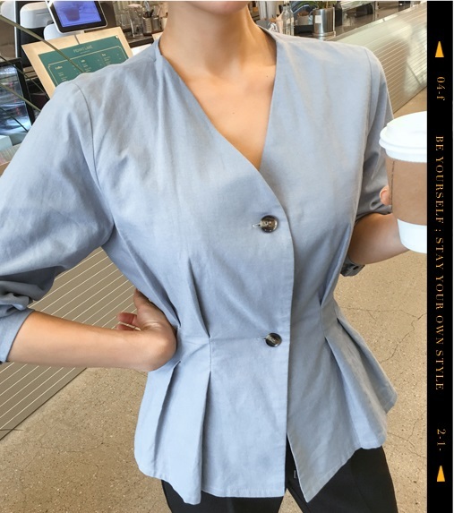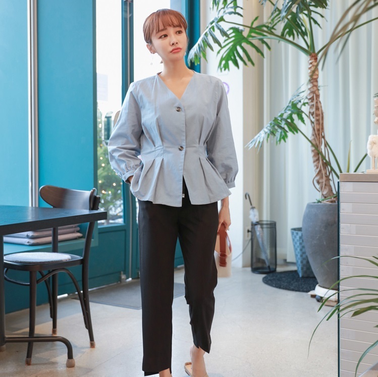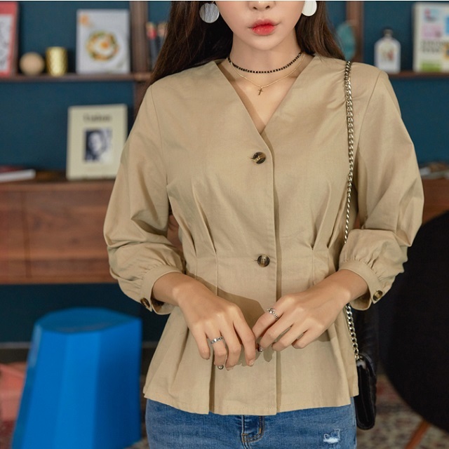 深Vネックとウエストがシェイプされたことにより、裾の広がりを演出するぺプラムなシルエットが女性らしい1枚。