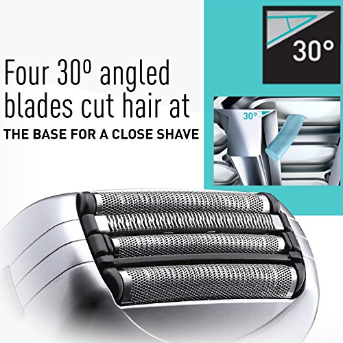 -. Feature : 4-Blade Cutting system with 30 Degree Nano Blades for a clean wet or dry shaving experience / 14,000 CPM fast Linear Motor Drive system, with a Multi-Flex Pivoting Head; 1-Hour charge for up to 45 minutes of usage / Multi-ft Arc Foil and a Ultra-thin Outer Foil; Pop-up trimmer, blue 1-stage LCD display / Sonic Vibration Cleaning mode, Lock button to prevent unit from going on / Travel Pouch included; 6.5"(H) x 2.7" (W) x 2.2" (D), 7.1oz