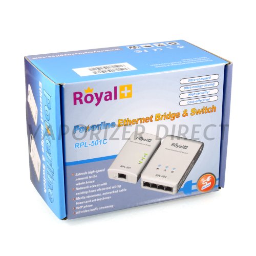 -. Binding : Electronics -. Brand : Royal -. EAN : 0639266396789 -. Feature : Plug-and-play to turn your home electrical systsem into a high-speed network / Low power consumption < 1 Watt when in idle mode / High speed data transmission to stream audio/video at 200Mbps / Connect up to 4 ethernet devices / High security: 128-bit data encryption -. Label : Royal -. Manufacturer : Royal -. PackageQuantity : 1 -. ProductGroup : PC Accessory -. ProductTypeName : NETWORKING_DEVICE -. Publisher : Royal -. Studio : Royal -. Title : Royal RPL-501C Powerline Ethernet Bridge & Switch - 4 Ports Connect Up to 4 Internet Devices -. UPC : 639266396789