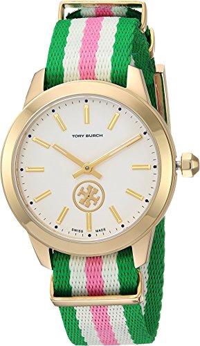Create eye-catching pop with timeless style when you have this fashion-forward Tory Burch® watch on your wrist. Woven fabric bracelet with buckle closure. Gold-tone stainless steel case. Round face features two-hand analog display. Swiss made. Signature brand logo on face. Water resistant up to 100 feet. Imported. Measurements: Case Height: 38 1⁄2 mm Case Width: 38 1⁄2 mm Case Depth: 9 mm Band Width: 17 3⁄5 mm Band Circumference/Length: 9 1⁄4 in Weight: 2 oz This product may have a manufacturer's warranty. Please visit the manufacturer's website or contact us at warranty@support.zappos.com for full manufacturer warranty details.Feature