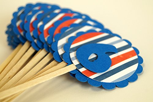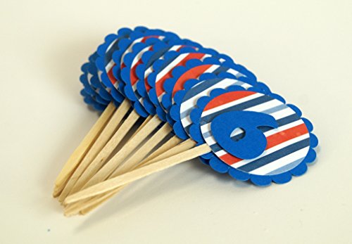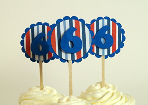 Studio : All About Details Publisher : All About Details Binding : Kitchen Product Description Celebrating 6th birthday is awesome! Decorate your cupcakes with these 6th Birthday Blue-red-white stripes cupcake toppers. Perfect to compliment similar color AAD's Happy Birthday Cupcake Wrappers. These toppers will also suit in train theme birthday party. Made up of 3 layers cardstock. - Blue textured cardstock for the circular scallop frame - Blue-Red-White stripes printed cardstock - Numeric design cut in blue textured cardstock The numeric one is set in double adhesive tape. This setting gives a floating illusion to the number. This cupcake topper has 2in diameter and 2.5in long food safe stick. The food safe stick gives you freedom on how tall you want the topper set in your cupcake. This cupcake topper compliments All About Details Blue/Red Trains Cupcake Wrappers and Blue/Red Happy Birthday Cupcake Wrappers. 0