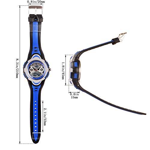 -. Feature : KIDS PERFECT WATCH - Perfect as kids' first watch or daily use watch. Digital and Analog display, 3ATM water resistant, back light, teach kids to tell time, day and date. No worries when washing hands, swimming or raining with the watch. Bright but soft EL back light helps to tell time in dark or at night. The band is adjustable, fits for children or teens. / EXPLORE MORE OTHER COOL FEATURES - Alarm, stopwatch, chime, 12/24 Hours, AM/PM, military time. Set stopwatch to run. Set alarm and chime to remind to do something, for example, to stop playing games, to go to school, to go home, to drink water, to take medicine and so on. / HIGH QUALITY & DURABLE - Made of high quality material. Japanese movement. Battery can last up to 3 years. The connection between the band and the watch is very strong. It is almost impossible to break it by kids. It is comfortable to be on wrist. / STYLISH AND FUN - Stylish and modern design. / AS A PERFECT GIFT - The watch is practical, cool and fashion. The watch is packaged in a nice circular metal can and then the can is put in a box.