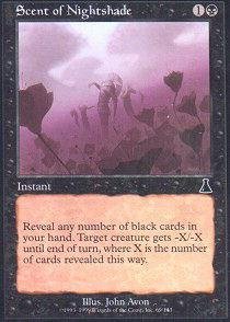 -. Binding : Toy -. Brand : Magic: the Gathering -. EAN : 0775070665977 -. Feature : Magic: the Gathering - Scent of Nightshade - Urza's Destiny / Black -. Label : Wizards of the Coast -. Manufacturer : Wizards of the Coast -. MPN : 0665977 -. PackageQuantity : 1 -. PartNumber : 0665977 -. ProductGroup : Toy -. ProductTypeName : TOYS_AND_GAMES -. Publisher : Wizards of the Coast -. Studio : Wizards of the Coast -. Title : Magic: the Gathering - Scent of Nightshade - Urza's Destiny by Magic: the Gathering -. UPC : 775070665977