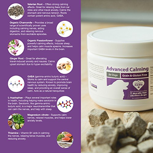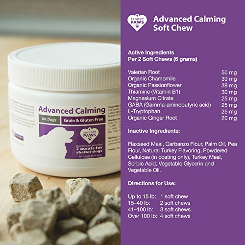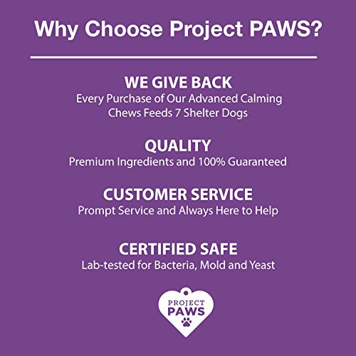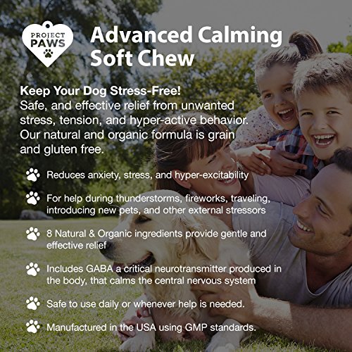 Project Paws Advanced Calming soft chews are formulated to relieve your dog's anxiety, nervousness, hyperactivity, tension or stress from traveling, thunderstorms, fireworks, veterinarian visits, introducing new pets or changes in everyday routine. Our Advanced Calming contains high-potency natural ingredients that are properly formulated for optimal results, and easily administered in a tasty turkey flavored soft chew. Can be used as a daily supplement or, as needed in stressful situations. For use in dogs only.Feature