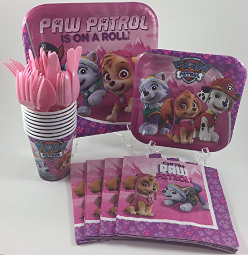 BashBox Pink Paw Patrol Girl Birthday Party Supplies Pack Including Cake & Lunch Plates, Cutlery, Cups & Napkins for 8 Guests