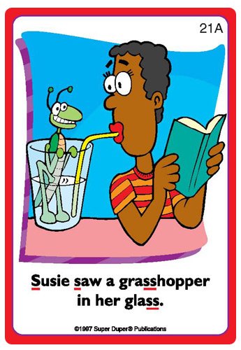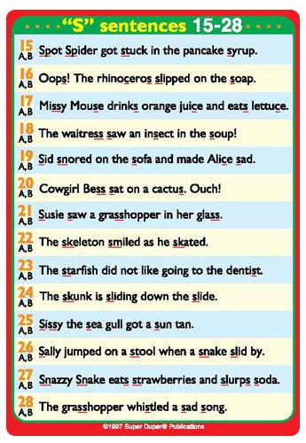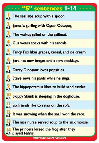 56 colorful cards (2 1/2" x 3 1/2") - 28 card pairs use funny scenes and sentences (i.e. Sissy the sea gull got a sun tan.) to target a specific speech sound