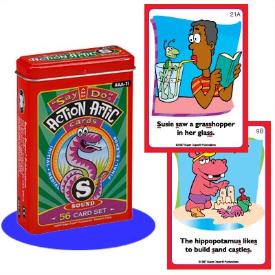 Single word articulation cards are great, but what do you do when children are ready to practice their sounds multiple times in the same sentence?Not to worry, Say and Do "S" Action Artic Cards will come to the rescue! This colorful and cute card set contains 28 pairs (56 cards) of sound-loaded sentences; two master lists; and two instruction/idea cards. Children will have a wonderful time with these humorous sentences and scenes. ("Darcy Dinosaur loves popsicles.") These cards are also excellent for improving vocabulary, grammar, and phonological awareness. "S" Action Artic Cards (2 ½" x 3 ½") have numbers and letters for convenient sorting. Stored in a sturdy tin.