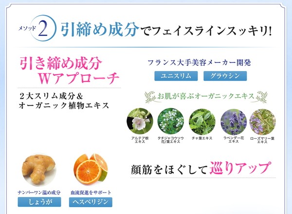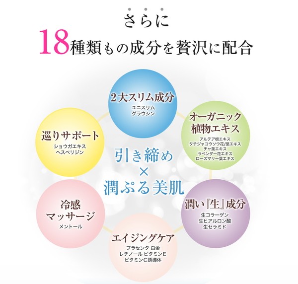 水、エタノール、BG、グリセリン、アスコルビルグルコシド、グルコシルヘスペリジン、マテチャ葉エキス、コーヒー種子エキス、カプリリルグリコール、ハマメリス葉エキス、アルテア根エキス、タチジャコウソウ花/葉エキス、チャ葉エキス、ラベンダー花エキス、ローズマリー葉エキス、ショウガ根エキス、プラセンタエキス、白金、ヒアルロン酸Na、加水分 解コラーゲン、グリチルリチン酸2K、トリエチルヘキサノイン、アーモンド油、オリーブ果実油、セラミド2、ホホバ種子油、パルミチン酸レチノール、メントキシプロパンジオール、カフェイン、グラウシン、メントール、カルボマー、キサンタンガム、ヒドロキシエチルセルロース、セチルヒドロキシエチルセルロース、PEG-20ソルビタンココエート、レシチン、PEG-60アーモンド脂肪酸グリセリル、ヤシ油アルキルグルコシド、ポリソルベート80、コーン油、水酸化K、トコフェロール、EDTA-2Na、フェノキシエタノール、メチルパラベン、エチルパラベン、香料、オレンジ油、カラメル |