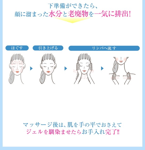 適量(マスカット粒大)を手に取り、お顔全体から首元にかけて、指がよくすべる程度にのばします。顔の中心から外側へ円を描くように、フェイスラインは引き上げるようにマッサージし、耳元から首をとおり鎖骨へ流します。特に乾燥が気になる場合は、マッサージ後にお手持ちの保湿化粧品をご使用ください。