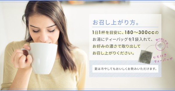 ・1日1杯を目安に、180~300mlのお湯にティーバッグを1袋入れて、お好みの濃さで取り出してお召し上がりください。
