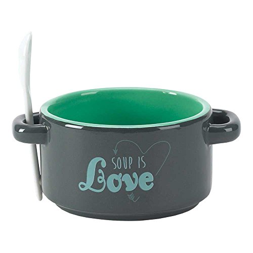 Soup is Love 14 Oz. Black and Teal Ceramic Dolomite Soup Bowl with Spoon
