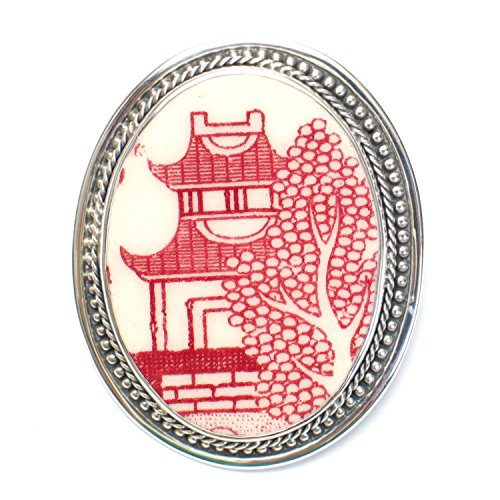 -. Title : Broken China Jewelry Red Willow Pagoda Sterling Oval Pin Brooch