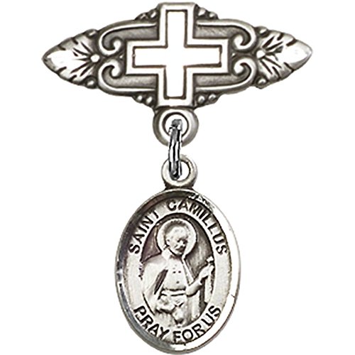 -. Title : Sterling Silver Baby Badge with St. Camillus of Lellis Charm and Badge Pin with Cross 1 X 3/4 inches