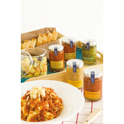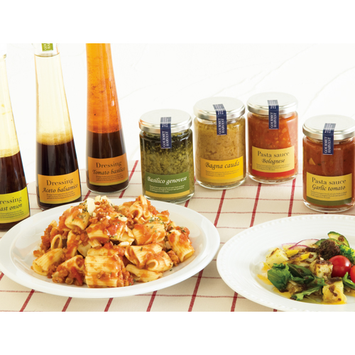 ●パスタソース(ガーリックトマト)120g・トマトソース120g・グレープシードオイル110g・トマトバジルドレッシング120ml・パスタ(コンキリエミックス)80g・パスタ(リガトーニ)90g×各1