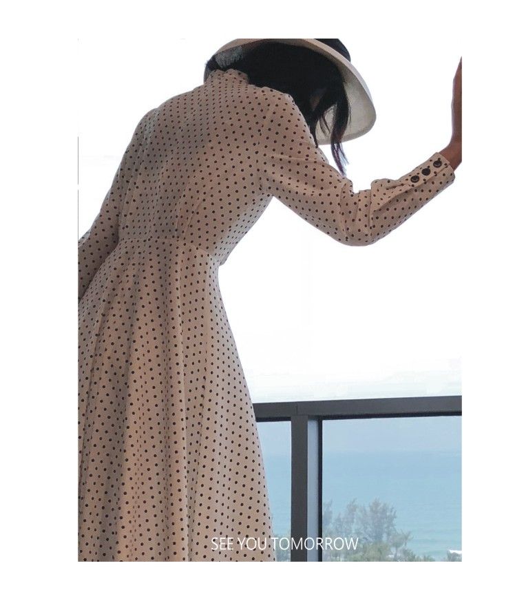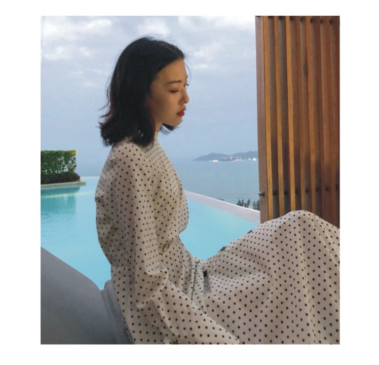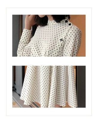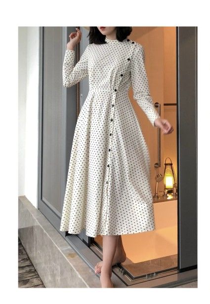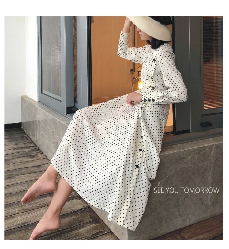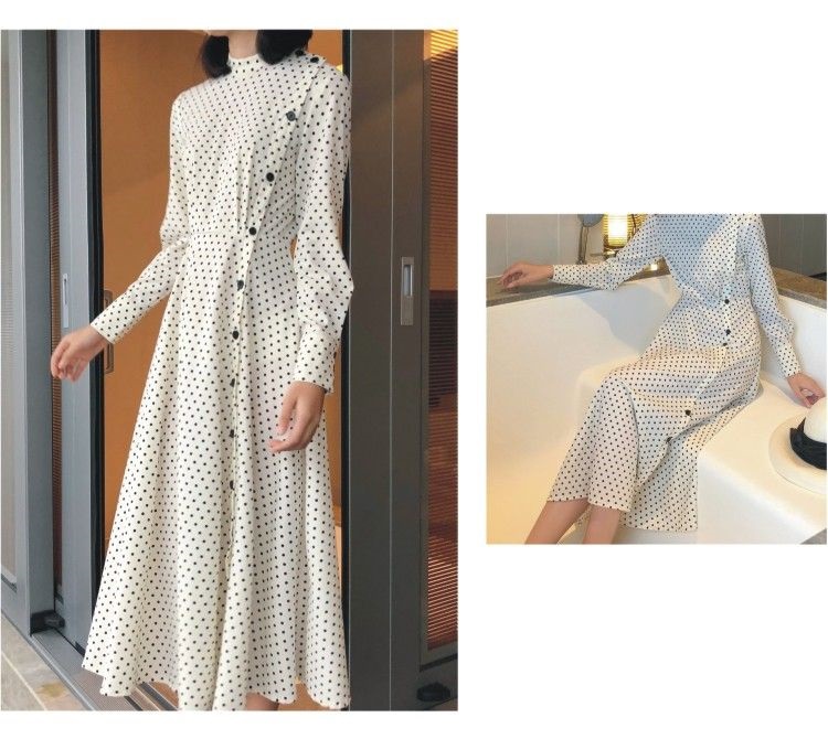 白×黒ドットが爽やかなミモレ丈のフレアワンピースです。