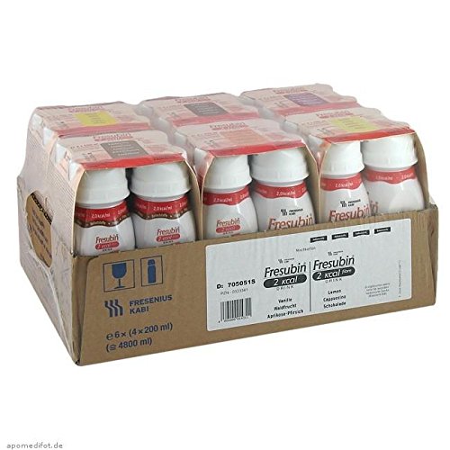 -. Feature : Fresubin 2kcal Drink - Mischkarton / Bedarfsdeckende Versorgung mit Vitaminen und Spurenelementen / 6 Geschmacksrichtungen (Vanille, Schokolade, Waldfrucht, Cappuccino, Lemon, Aprikose-Pfirsich) / Eiweißreiche Trinknahrung mit sehr hoher Energiedichte / Geschmacksrichtungen Schokolade, Lemon und Cappuccino enthalten präbiotische Ballaststoffe