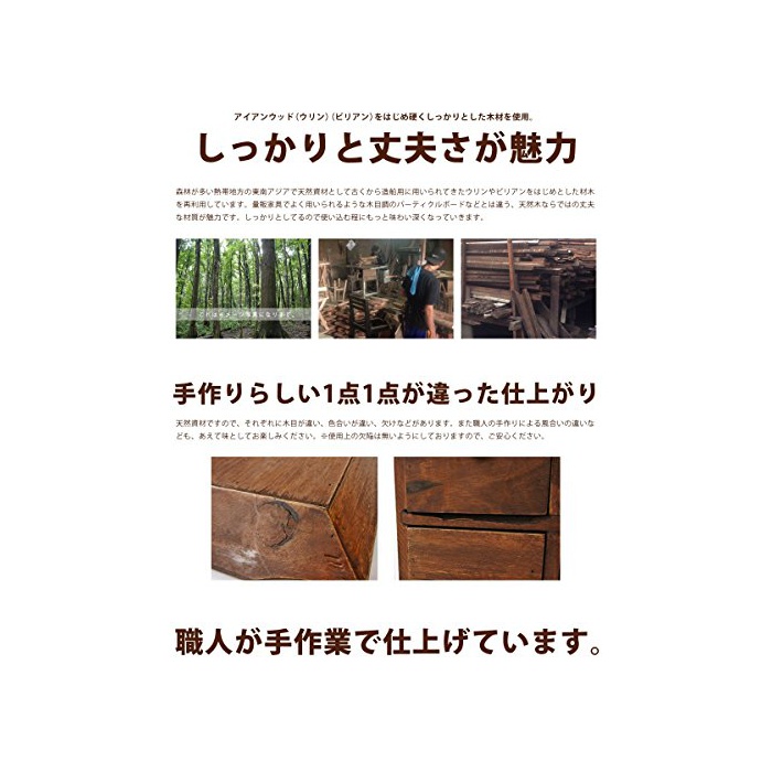 【상품 설명】방부성 내구성 이 뛰어난 아이언 우드를 비롯한 리사이클 우드를 사용,장인의 수작업에 마무리되어 있습니다. 튼튼한 소재이므로,여러 해의 사용으로도 적합하게 있습니다. 나무결이나 부족해라 등의 목만이 가능한 촉감을 잔재,얼룩이나 녹감 등을 굳이 내밀기 있습니다. 1점씩 표정이 다르게 있기 때문에,미리 승낙을 부탁합니다.