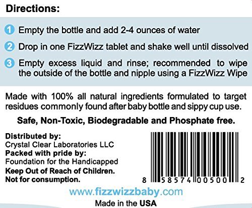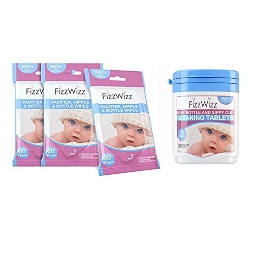 -. Feature : Each Pack of Wipes Contains 30 Wipes - Clean the exterior of any bottle, nipple, pacifier or baby toy. / As a perfect compliment use FizzWizz Cleaning Tablets to clean the inside of the bottle or sippy cup. / Hypoallergenic, paraben free, alcohol free, food grade preservatives, gentle cleansing, biodegradable. Soothing Chamomile Scent. / Premium, safe, naturally derived ingredients. / MADE IN THE USA!