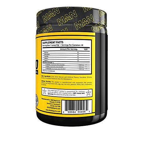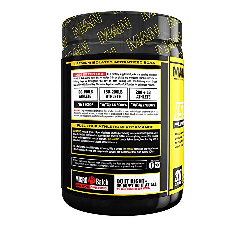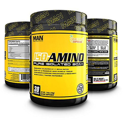 -. Feature : CLINICALLY PROVEN BCAA RATIO! BCAA amino acids in a 2:1:1 ratio have been clinically studied and PROVEN to effectively aid in muscle repair, growth, muscular energy and even fat loss. BCAA supplements are comP.R.Ised of 3 branched chain amino acids - Leucine, Iso-Leucine and Valine. BCAA products with inflated ratios of 8:1:1 or even 10:1:1 show no added benefit over their 2:1:1 counterpart. ISO-AMINO stuck with the tried and true 2:1:1 ratio... "if it's not broke, don't fix it". / CLEAN - NO ARTIFICIAL COLORS OR DYES. ISO-AMINO is as clean as possible, containing no artificial colors or dyes, almost mixes completely clear in water! This is something you'll want to sip on all day. ISO-AMINO is a BCAA powder rather than BCAA capsule for enhanced absorption and utilization. / OUT OF THIS WORLD FLAVORS! It has nothing to do with science or efficacy, but it's important to enjoy what you spent your hard earned money on. We take flavor and mixability very seriously. This is where ISO-AMINO stands as the clear leader. MAN Sports has made monumental advances in flavor systems to provide extremely unique, mouthwatering, one-of-a-kind flavors. / 100% MONEY BACK GUARANTEE! We want to make sure you're 100% happy and satisfied with your experience, so we back our products with a 100% MONEY BACK GUARANTEE. / ISO-AMINO has quickly become known as the best BCAA supplement on the market due to its simple formula and out of this world taste! ISO-AMINO features 5 grams of instantized BCAAs in a research validated 2:1:1 ratio. Pure BCAAs are everything you need to build, repair and trigger lean muscle growth. ISO-AMINO is a throwback to the old school BCAAs that are just that.... pure BCAAs. No added marketing fluff, proP.R.Ietary blends or under dosed "everything & the kitchen sink" formulas that only cushion the manufacturers wallet.
