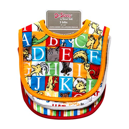 Keep messes to a minimum with this stylish Dr. Seuss by Trend Lab alphabet seuss 3 pack bib set. Set features 3 bibs each with fun, Dr. Seuss prints on the front, absorbent terry on the back and a coordinating trim. Bib patterns include: one charming stripe print in multicolored palette of gray, tan, yellow, marigold, ribbon red, grass green and shades of blue with black and white accents; one Dr. Seuss multi-book titles typography print; and one mini alphabet squares prints. Each bib measures approximately 8" x 12" with velcro closure. Coordinates with Dr. Seuss by Trend Lab alphabet seuss collection. Product sold under license from Dr. Seuss enterprises, L.P.Feature