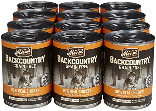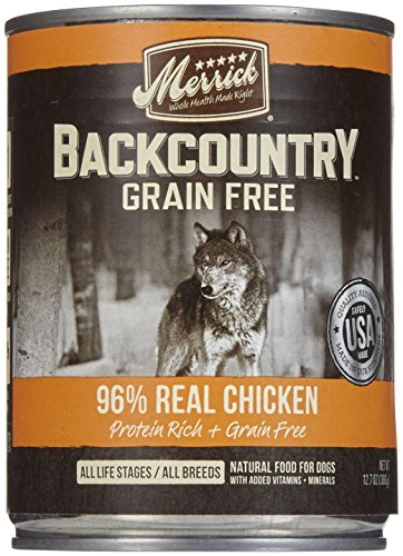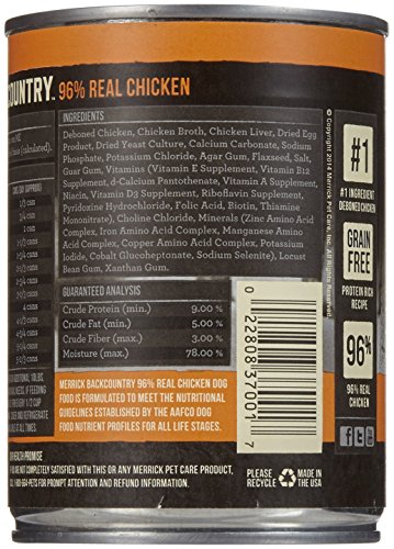 Merrick Backcountry 96% Real Chicken Grain Free Can Dog Food Merrick Backcountry 96% Real Chicken is an all-natural grain-free ancestral canine diet for dogs of all life stages and all breeds. It is complete and balanced nutrition to add moisture and flavor to a dog's diet. Protein rich, it contains 96% poultry. The grain-free loaf recipe is ideal for dogs with food sensitivities. The delicious flavor will have them craving more. Features: Made in the USA For dogs of all life stages and all breeds Protein rich with 96% poultry Loaf recipe Grain free Complete and balanced Item Specifications: Flavor: Chicken Size: 12.7oz, case of 12 Guaranteed Analysis: Crude Protein: min 9% Crude Fat: min 5% Crude Fiber: max 3% Moisture: max 78% Calories: 936 kcal/kg, 341 kcal/can Ingredients: Deboned Chicken, Chicken Broth, Chicken Liver, Dried Egg Product, Dried yeast Culture, Calcium Carbonate, Sodium Phosphate, Potassium Chloride, Agar Gum, Flaxseed, Salt, Guar Gum, Vitamins (Vitamin E Supplement, Vitamin B12 Supplement, d-Calcium Pantothenate, Vitamin A Supplement, Niacin, Vitamin D3 Supplement, Riboflavin Supplement, Pyridoxine Hydrochloride, Folic Acid, Biotin, Thiamine Mononitrate), Choline Chloride, Minerals (Zinc Amino Acid Complex, Iron Amino Acid Complex, Manganese Amino Acid Complex, Copper Amino Acid Complex, Potassium Iodide, Cobalt Glucoheptonate, Sodium Selenite), Locust Bean Gum, Xantham Gum. Daily Feeding Guidelines: The following are general feeding recommendations. Many factors, including age, breed, activity level, and individual metabolism contribute to the need for adjusting portion sizes. Weight of Dog Cans/Day 3lbs 1/3 can 6lbs 3/4 can 10lbs 1 can 15lbs 1 1/3 can 20lbs 1 3/4 can 30lbs 2 1/3 can 40lbs 2 3/4 can 50lbs 3 1/3 can 60lbs 4 cans 70lbs 4 1/3 can 80lbs 4 3/4 can 90lbs 5 1/4 can 100lbs 5 2/3 can Merrick Backcountry Dog Food is formulated to meet the nutritional levels established by the AAFCO Dog Food Nutrient Profiles for all life stages.Feature