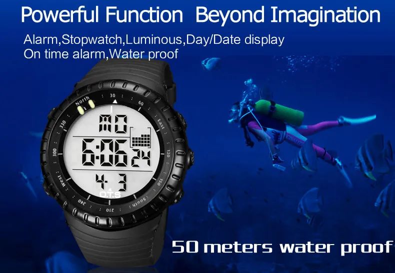 Feature:Alarm,Back Light,Water Resistant,Repeater,Stop Watch,Complete Calendar,Chronograph,Auto Date,LED display,Diver
