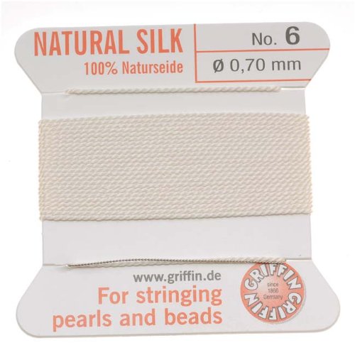GRIFFIN SILK BEAD CORD WITH ATTACHED NEEDLE Size 6 Cord, 2 Meters Long Naturseide (German for "Natural Silk") is the traditional stringing material used by beaders for centuries. You can't knot pearls without silk. And nothing hangs like silk cord, either. The thread comes with an attached needle that allows you to pass the cord through pearls, beads and stones without having to double the cord over. We like this thick silk cord for making those knotted 'tin cup' necklaces, where you can see some cord in between each section of beads on the necklace. We have most Griffin colors. Quantity: Each lot consists of 1 package of size 6 bead cord, about 2 meters in length, plus attached needle.Feature