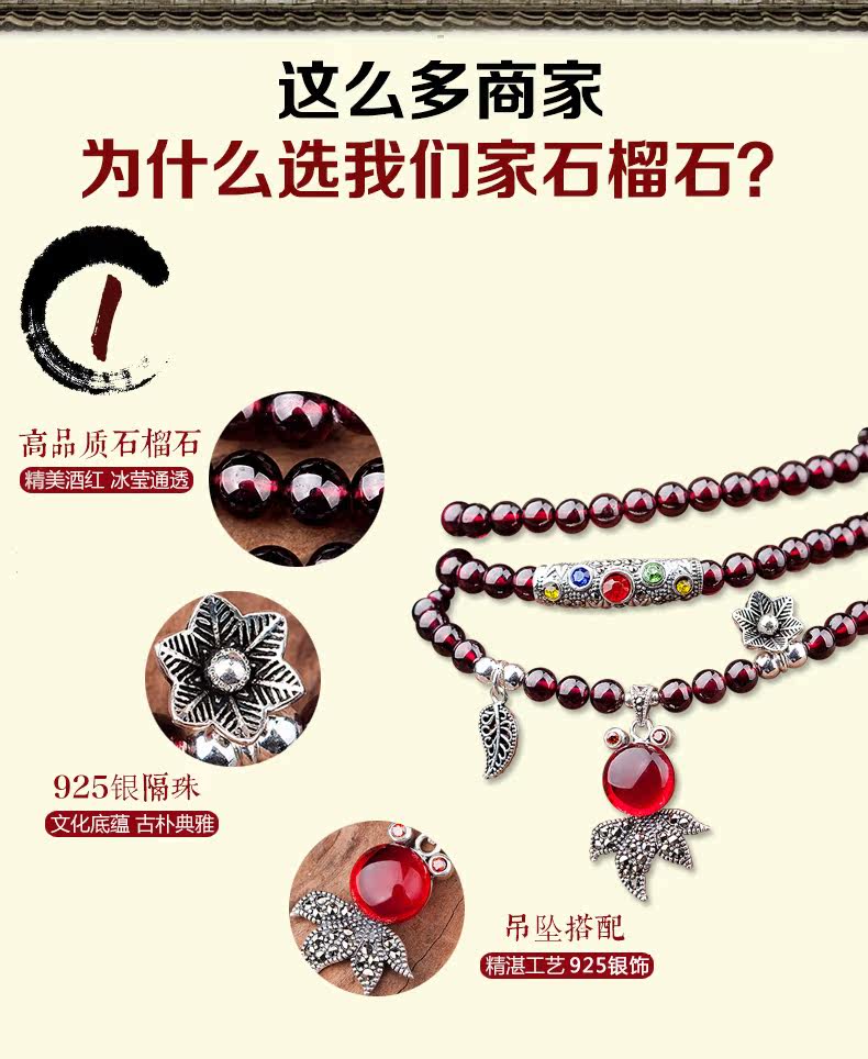 天然酒红石榴石手链女 多层多圈手串925银水晶佛珠饰品