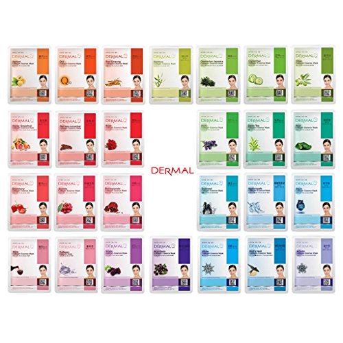 -. Feature : Dermal Korea collagen essence full face facial mask sheet 26 combo pack / 26 different types of facial mask will help your skin more healthy, clear and elastic (as pictured) / Contains vitamin E and collagen which keeps your tired skin lively and healthy / Good quality felt soaked with various minerals and ingredients is used for effective absorption / Eye area is not completely cut out - you can put it back to cover your eye lid