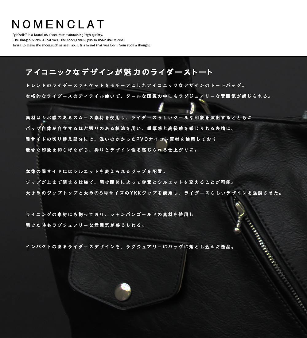 | 商品説明 | トレンドのライダースジャケットをモチーフにしたアイコニックなデザインのトートバッグ。 本格的なライダースのディテイル使いで、クールな印象の中にもラグジュアリーな雰囲気が感じられる。 素材はシボ感のあるスムース素材を使用し、ライダースらしいクールな印象を演出するとともに バッグ自体が自立するほど張りのある製法を用い、重厚感と高級感を感じられる表情に。 両サイドの切り替え部分には、洗いのかかったPVCナイロン素材を使用しており、 無骨な印象を和らげながら、拘りとデザイン性を感じられる仕上がりに。 本体の両サイドにはシルエットを変えられるジップを配置。 ジップが上まで閉まる仕様で、開け閉めによって容量とシルエットを変えことが可能。 大きめのジップトップと太めの8号サイズのYKKジップを使用し、ライダースらしいデザインを強調させた。 |
