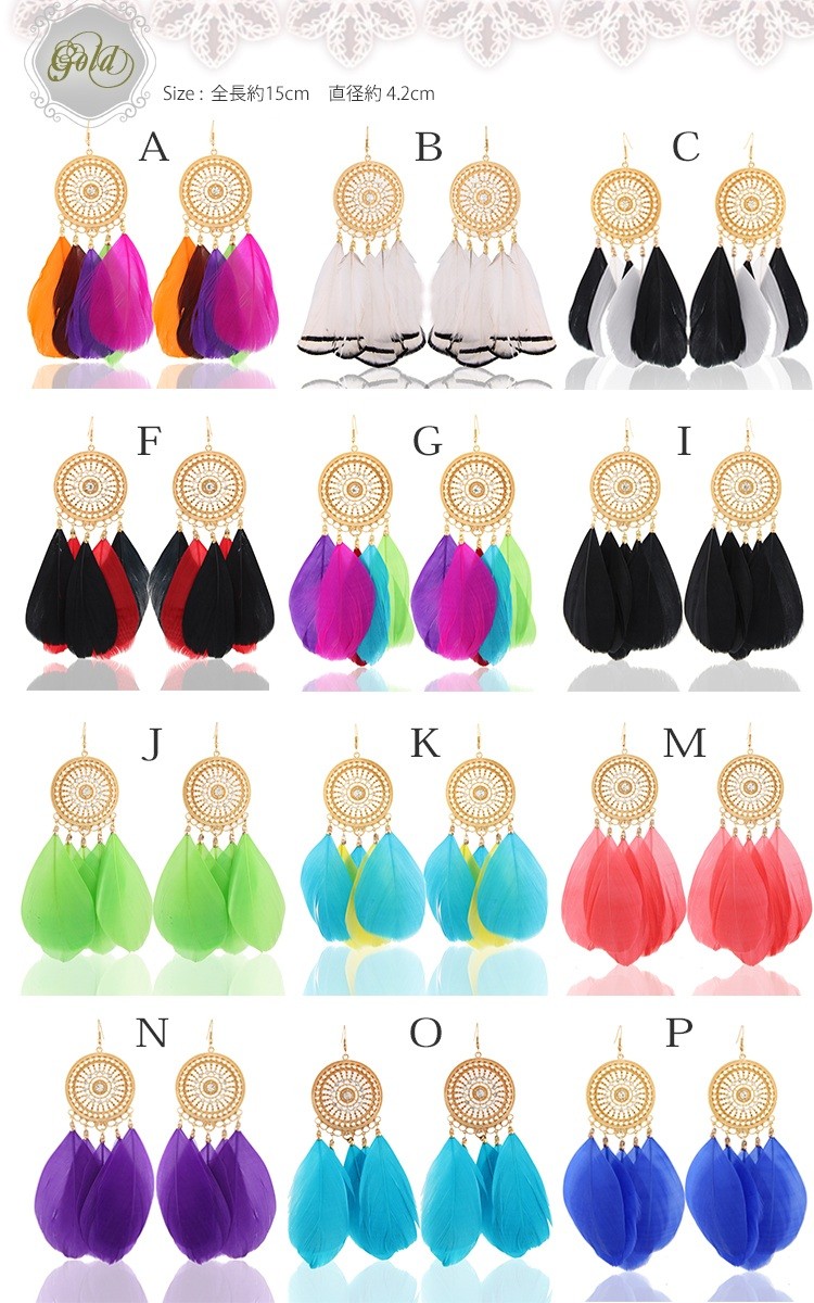 エスニック丸型ヘッドフェザーピアス(16種類)一つ一つ手作りのこだわりの一品♪エスニック感をアップしてくれるゴール、シルバーのヘッド部分にはラインストーンが輝き華やかさを演出してくれます♪『合計4980円税別以上で送料無料』