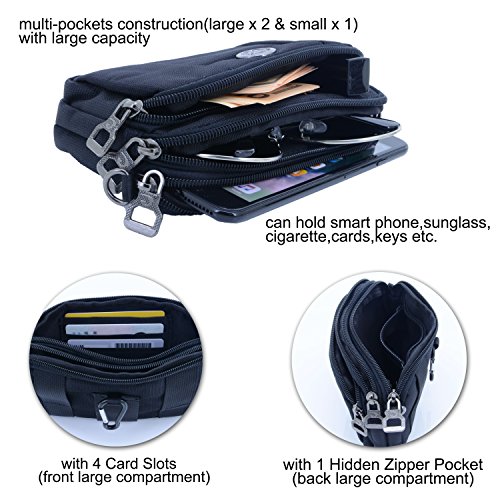 SO MANY DIFFERENT SIZE POCKETS. - As a convenient and functional organizer,the utility gadget pouch has a great availability of a number of different pockets,it has 2 large zippered pockets,where you can put cell phone,sunglass,cigarette etc.,and 1 small zipped pocket in front for cards,keys,lighter etc.
