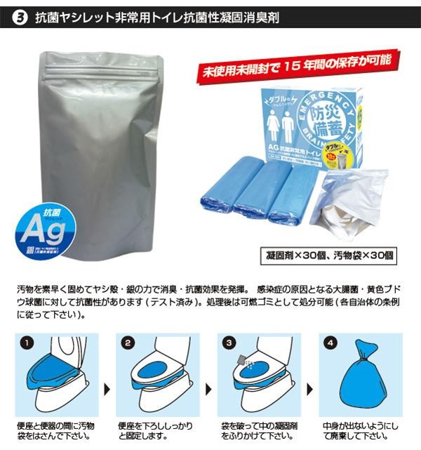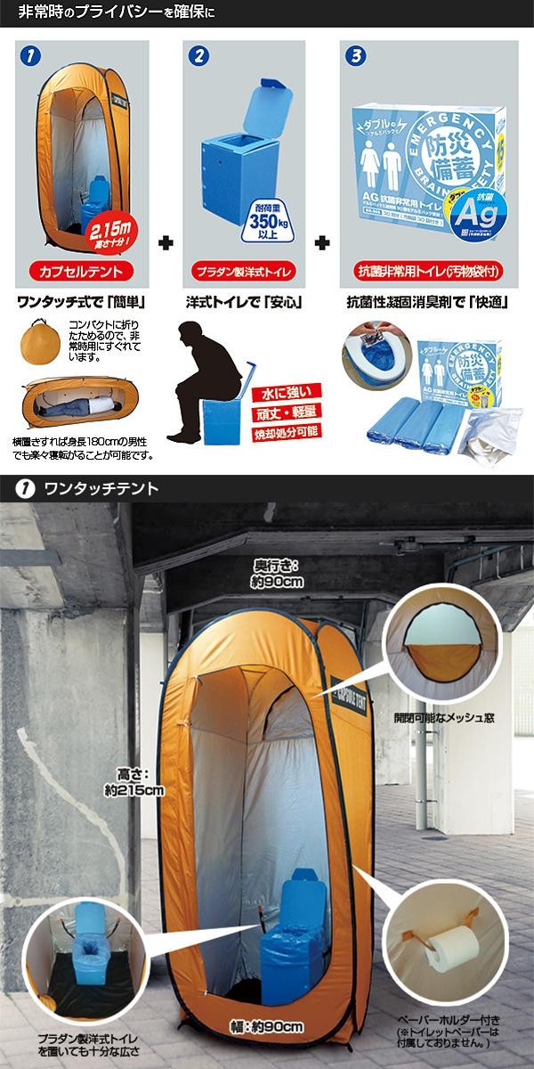 | ワンタッチで組み立て可能なカプセルテント、工具不要ですぐに組み立てられるプラダン製洋式トイレ、抗菌非常用トイレ(抗菌性凝固消臭剤30個・汚物袋30袋)の3点セットです。どこでも簡単に設置可能なので、災害時、そこが個室トイレに早変わり!! |
