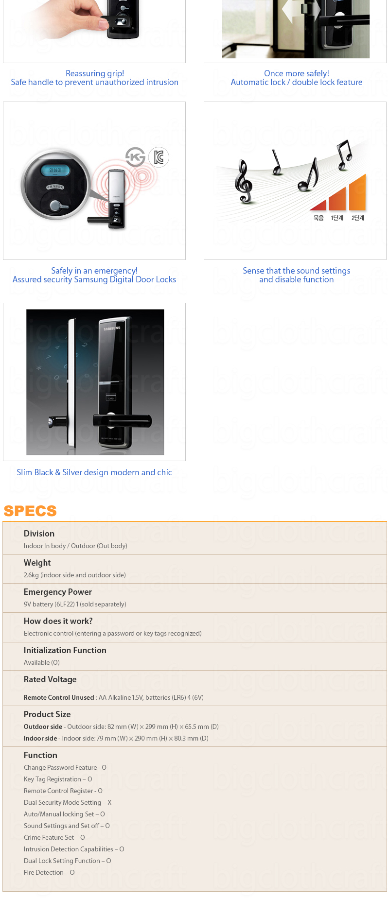 #Feature - Reassuring grip! Safe handle to prevent unauthorized intrusion - Once more safely! Automatic Lock / double lock feature - Safely in an emergency! Assured Samsung Digital Door Locks - Sense that Sound settings and disable function - Slim Black & Silver design modern and chic |