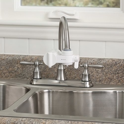 Studio : Verbatim Publisher : Verbatim Binding : Kitchen Product Description The verbatim faucet mount filtration system allows you to quickly and easily switch between filtered and unfiltered water as needed. All verbatim water filtration products feature unique hollow-fiber membrane filtration technology. Developed by Mitsubishi rayon, the hollow-fiber membrane works in combination with activated carbon to reduce contaminants, while allowing beneficial minerals to remain in your water. NSF certified and BPA-Free, the verbatim faucet mount filtration system has 3-water flow settings and features a sleek, streamlined design. Our high-capacity filter has over 2x the capacity of leading faucet mount filters and can be changed in seconds. The verbatim faucet mount filtration system is backed by a verbatim 2-year limited warranty. (Does not apply to filter. Filter features a 30-day limited warranty.). 0
