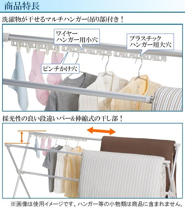 | 軽くてサビにくいアルミパイプ仕様の布団干しです。マルチハンガー(吊り部)付きで洗濯物も干せる多機能タイプです。干し部のバーは段違いになっているので採光性がよく乾きが早いです。使用しない時はコンパクトに収納ができます。 |