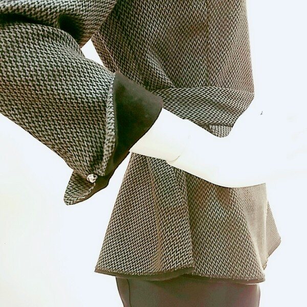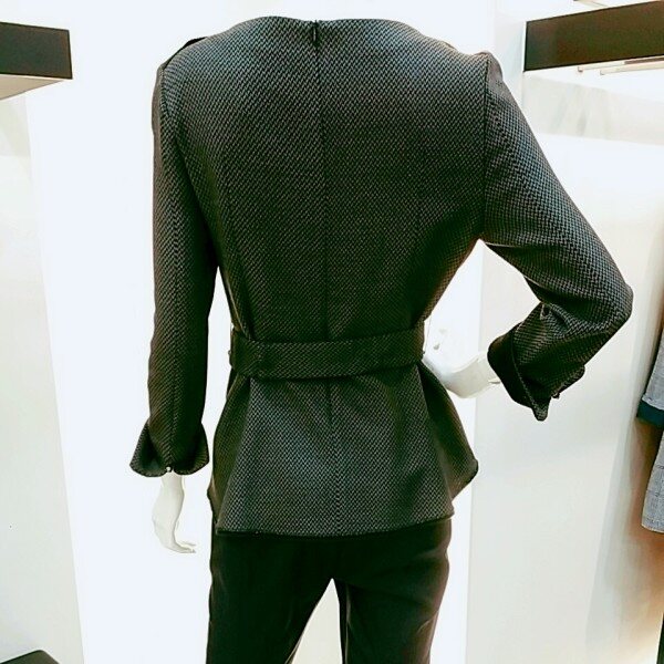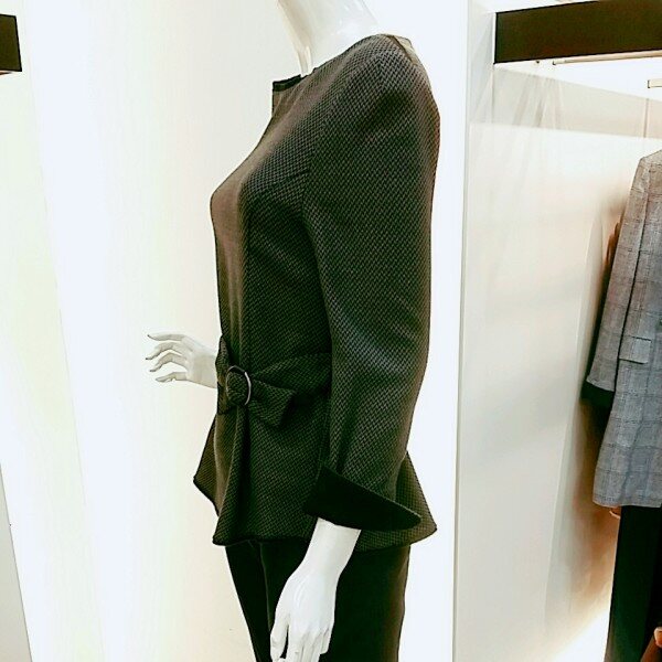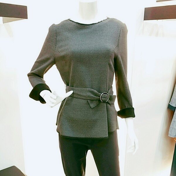 라운드 블라우스에요~ 신축성도 좋고~ 소매배색이 블랙으로 들어가 있어서 블랙스커트랑 코디하시면 세트로 입으신것 같아서 이뻐요~ 밸트가 부담스러우시면 안하셔도 허리라인 이쁘게 잡혀 있어요~