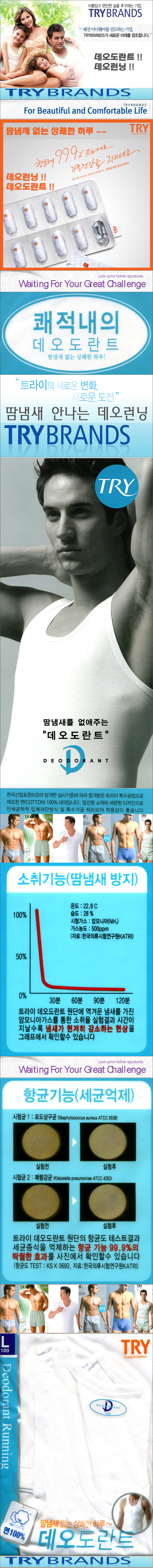 땀냄새가 안나는 TRY 데오런닝은 면 100%로 특수 가공하여 일반 런닝에서 느끼실수 없는 착용감과 쾌적함을 드립니다