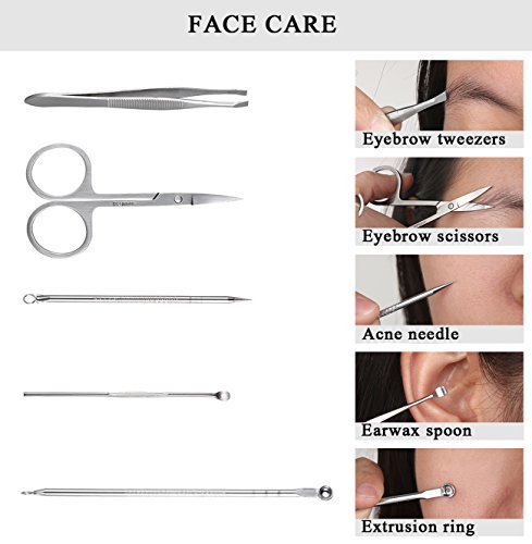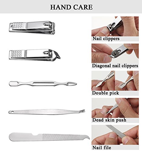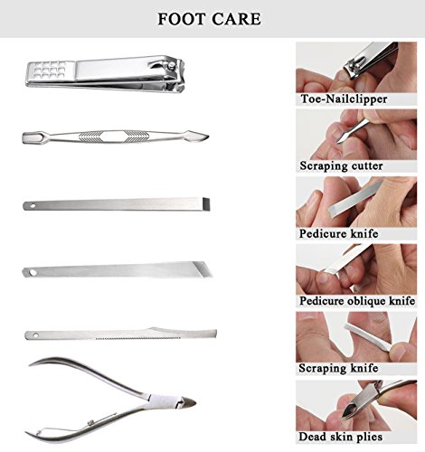 This manicure pedicure set is made with sturdy high-quality stainless steel,never rust or tarnish,will can meet all of your daily beauty routine, no need to buy any nail clipper tools separately, great gift for your wife / daughter / husband / girlfriend / boyfriend / mom / dad / friends in XMAS, Birthday, Mothers day, Fathers day, Marriage, Valentines day, Easter, Anniversary, Thanksgiving etc. Package Includes: - 1x Ear Pick - 1x Nail File - 1x Acne Needle - 1x Nail Clipper - 1x Pedicure Knife (Oblique) - 1x Pedicure Knife (Plain) - 1x Scraping Knife - 1x Ear Pick - 1x Eyebrow Tweezer - 1x Scraping Cutter - 1x Toe-Nail Clipper - 1x Eyebrow Scissors - 1x Dead skin pliers - 1x Double Sided Pick - 1x Diagonal Nail Clipper - 1x V-Shaped Cuticle Trimmer - 1x Portable Luxurious Travel Case Note: When you're using them, please be careful.Because it is very sharp 0