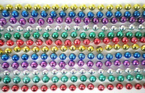 These metallic red, green, gold, hot pink, silver and blue Mardi Gras beads that have a multitude of uses. To gain access for paid events, to add sparkle and color for your school team events or corporate functions, great for home parties to add that little something to your party theme. They are individual strands of continuous color 33" long of 7mm thick beads made of bright, shinny durable plastic.--33 inch 07mm Round Metallic 6 Color Mardi Gras Beads - 6 Dozen (72 necklaces)