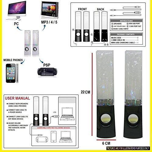 Feature : Brings vivid and clear visual musical LED light shows, very bright and brilliant and bright / These dancing water speakers come in multiple colors rather hot and in fashion, great gifts for anyone who loves to listen to music / Sound comes out with very nice, clear and amazing quality / The height of the fountain spray will increase with the volume of the music, and go along with the beat of the song as well / Easy to set up: They are 9-inches tall and compatible with any audio device that has a 3.5mm audio jack connection