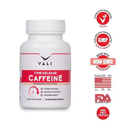 ENERGY THAT LASTS FOR HOURS - VALI Time Release Caffeine isn't a normal 100mg caffeine pill. Our caffeine is microencapsulated, which means it's an extended release formula and is absorbed into your body over time. The caffeine is released over a sustained period of time giving you a natural feeling of even and smooth boost of energy for hours on end.