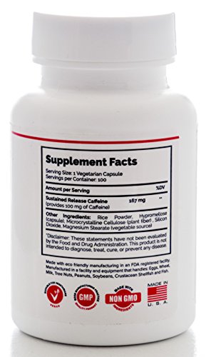 CLEAN FORMULA & ZERO ADDITIVES - Simply a vegetarian capsule with 167 milligrams of sustained release caffeine that delivers to you 100mg of caffeine. Zero artificial flavors, colors, or sweeteners. Free of banned and questionable substances. Gluten free. No soy, No nuts, Non-GMO ingredients. PROUDLY made in the USA in an eco friendly FDA registered facility under GMP guidelines.