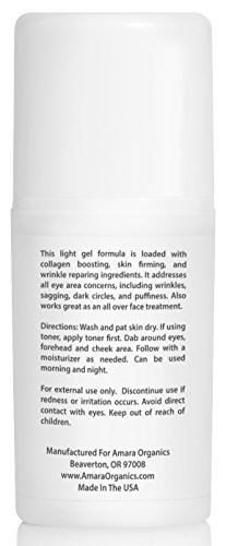 -. Binding : Misc. -. Brand : Amara Organics -. EAN : 0820103721127 -. Feature : REDUCE DARK CIRCLES & PUFFINESS: This lightweight gel formula is packed with powerful ingredients to address all eye area concerns. Cooling cucumber instantly soothes and awakens puffy eyes. Hyaluronic Acid plumps and hydrates while peptides and plant stem cells rejuvenate skin on a cellular level. Say goodbye to dark circles, puffiness, bags, and crow's feet and reveal refreshed, radiant eyes. / INSTANTLY FEEL RESULTS: This soothing, lightweight gel glides smoothly onto delicate skin and absorbs quickly with no greasy residue. Instantly awakens and tightens tired, puffy eyes. Leaves skin feeling silky, smooth, and hydrated. / NATURAL, CRUELTY FREE & MADE IN USA: We use only the best, natural ingredients available, with no harsh chemicals, sulfates, parabens, alcohol, or artificial fragrances, colors, or dyes. Our products are never tested on animals. / NOT JUST FOR YOUR EYES: This powerful anti-aging formula works great as an all over face and neck treatment. Excellent to use on the forehead, around the lips, laugh lines, and neck to reduce fine lines and wrinkles, plump, firm, and hydrate skin. Also great for hands to slow aging. / WORKS OR YOUR MONEY BACK - Manufacturer's Guarantee: We back our products up with a 365-day hassle-free money back guarantee, no matter where you buy our product. There's absolutely no risk to you when you order now! If you aren't completely satisfied, simply contact us and we'll give you a full refund, no questions asked (you don't even have to return the bottle). Our #1 priority is to make sure our customers are completely happy. -. Label : Amara Organics -. Manufacturer : Amara Organics -. MPN : 820103721127 -. PackageQuantity : 1 -. PartNumber : 820103721127 -. ProductGroup : Beauty -. ProductTypeName : BEAUTY -. Publisher : Amara Organics -. Size : 0.5 -. Studio : Amara Organics -. Title : Amara Organics Eye Cream for Dark Circles and Puffiness with Peptides, .5 fl. oz. -. UPC : 820103721127